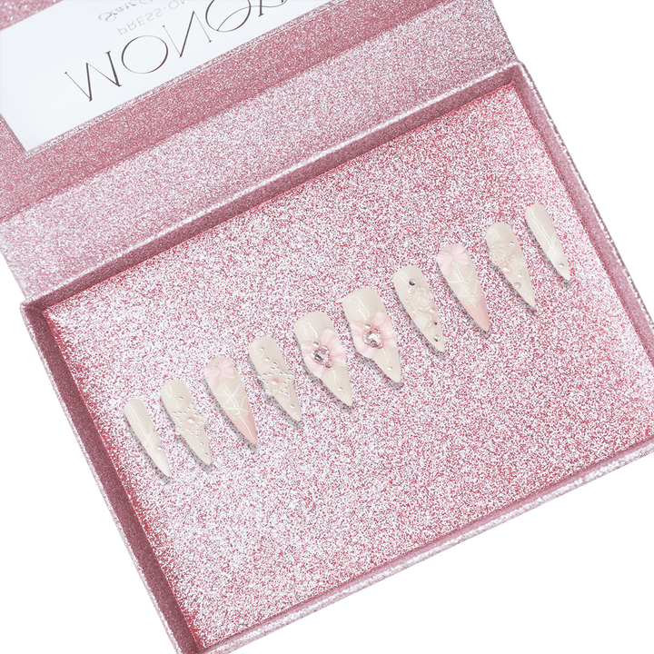chloe's design is an ode to elegance and charm. with a translucent nude base, the look is adorned with soft pink ribbons, dainty pearl details, and intricate floral embellishments. the lace-like accents and subtle sparkle create an ethereal, fairytale-inspired finish. perfect for brides or those seeking a romantic and delicate aesthetic, this design captures a whimsical beauty that enchants.